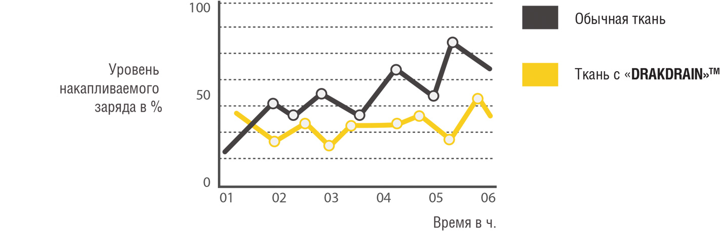 Дополнительно в состав данной ткани включается специальная нить «DRAKDRAIN»ТМ с низкой степенью удельного сопротивления в 10–105 Ом, заметно сокращающая уровень накопления поверхностного статического заряда и, как следствие, Снижение вероятности возникновения искры.