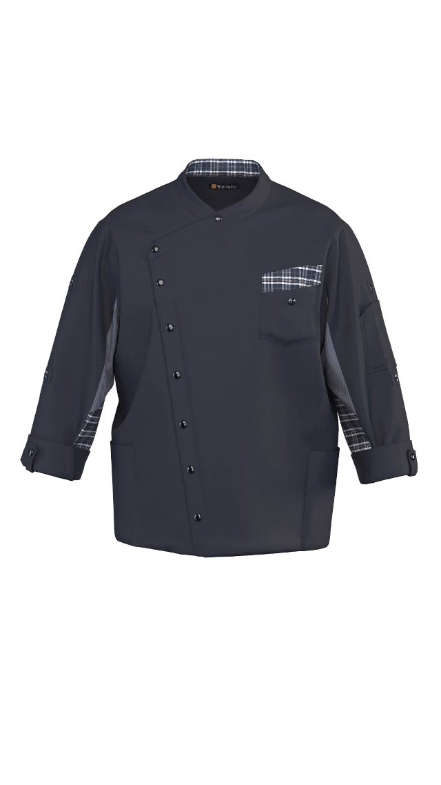 Мужской поварской китель с ассиметричной застёжкой- дизайнерская модель с длинными рукавами, которые можно подвернуть и застегнуть на кнопку. Вставки из трикотажной сетки создают идеальную посадку по фигуре, обеспечивая свободу движения и воздухопроницаемость, что особенно важно в помещениях с высокой температурой. Все швы отстрочены дополнительной строчкой, что обеспечивает дополнительную прочность изделию.