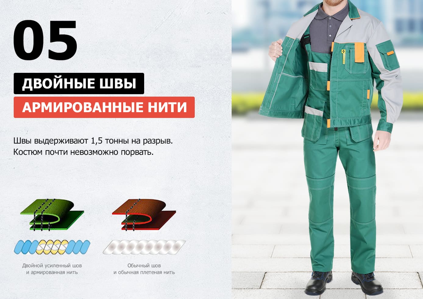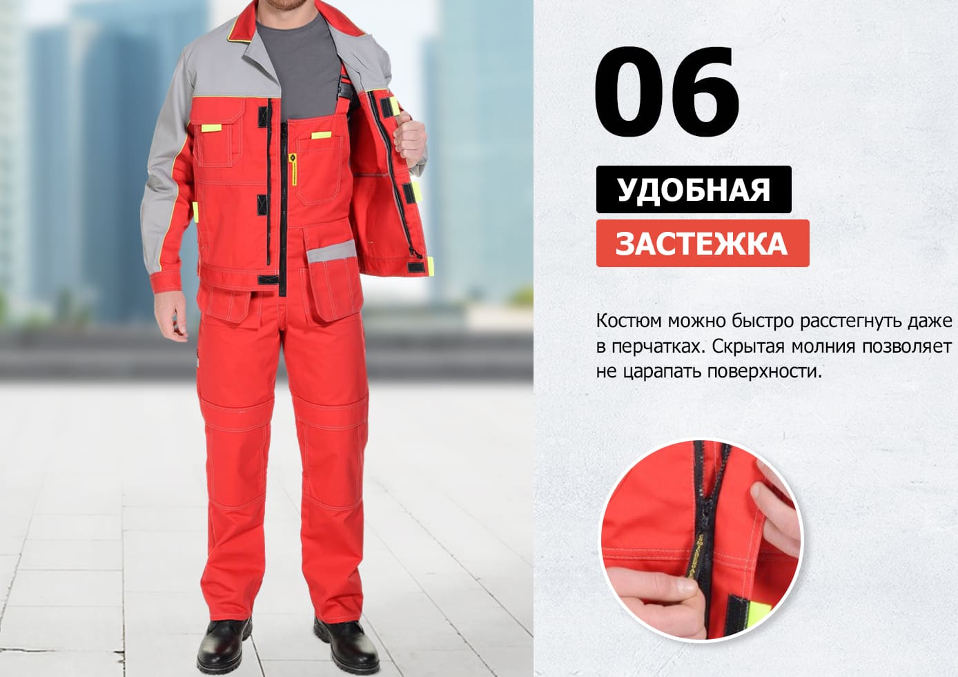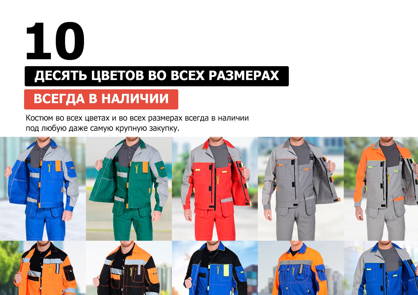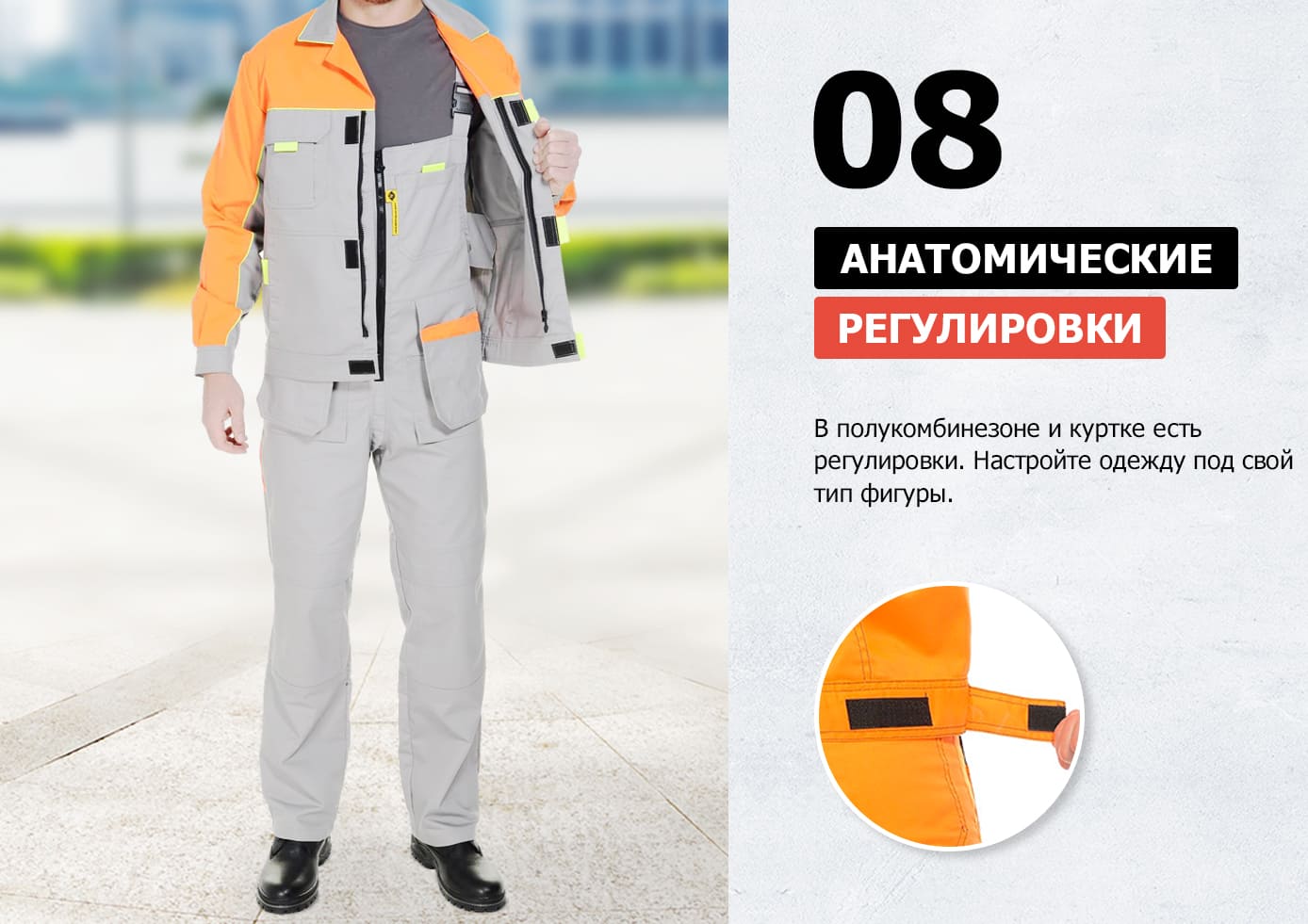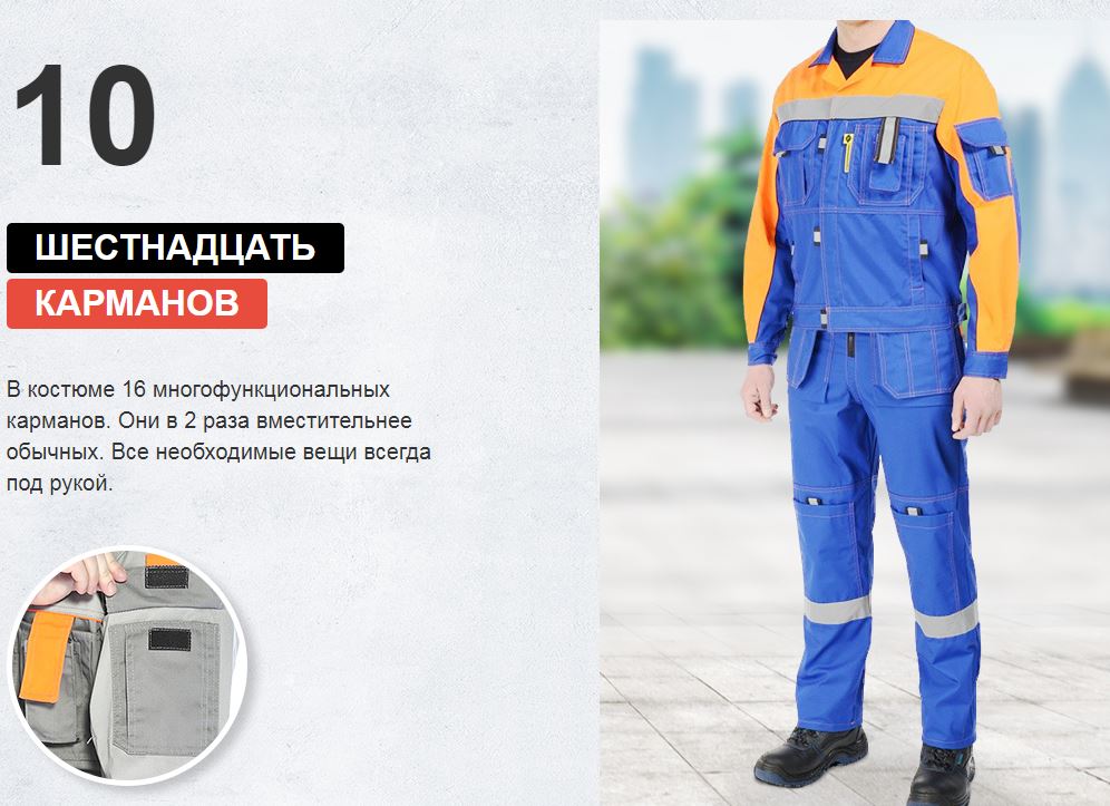 Уникальный рабочий костюм с продуманными до мелочей деталями: 10 разных цветовых решений, 16 карманов, анатомические регулировки, скрытая молния, двойные швы и еще более 20 особенностей.